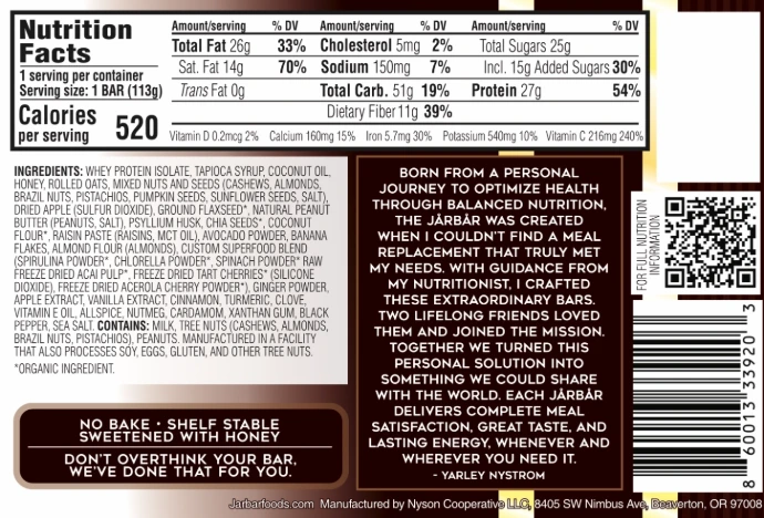 Whey protein isolate, honey, pepitas (roasted, salted), sunflower seeds (roasted, salted), coconut oil, rolled oats, tapioca syrup, glycerin, dried apple powder, ground flax seeds*, peanut butter, ground chia seeds*, coconut flour*, superfood blend (spirulina*, cracked cell wall chlorella*, freeze-dried spinach*, freeze-dried acerola cherry*, freeze-dried acai*, freeze-dried tart cherry*), ground ginger, avocado powder, banana powder, ground cinnamon, vanilla extract, apple extract, xanthan gum, ground turmeric, ground nutmeg, ground allspice, ground cardamom, ground clove, ground black pepper, rosemary extract powder, Himalayan pink salt.